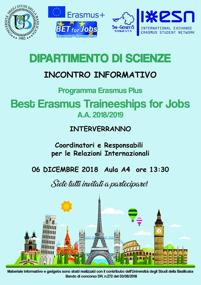 Interverranno coordinatori e responsabili per le Relazioni Internazionali, per dare informazioni in merito all'uscita del bando di concorso Best Erasmus Traineeships for Jobs per l’a.a. 2018/2019.