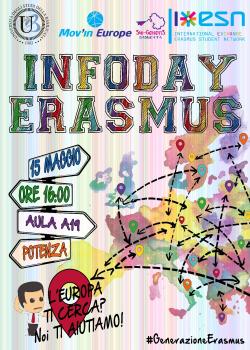 ESN Sui-Generis Basilicata presenta "InfoDAY Erasmus+ 2018", un progetto in collaborazione con l'Università Degli Studi della Basilicata e con l'Ufficio Relazioni Internazionali, che ha come obiettivo quello di informare e promuovere l'Erasmus dando tutte le informazioni possibili agli studenti interessati.