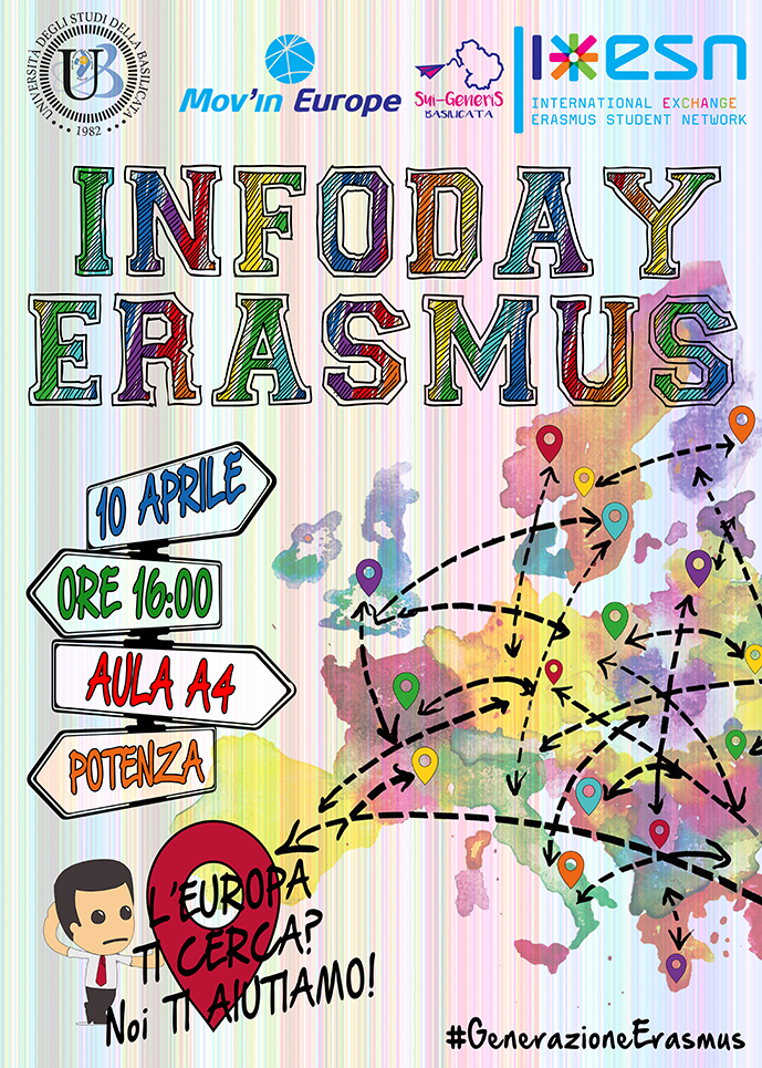 ESN Sui-Generis Basilicata presenta "InfoDAY Erasmus+ 2019", un progetto in collaborazione con l'Università Degli Studi della Basilicata e con l'Ufficio Relazioni Internazionali, che ha come obiettivo quello di informare e promuovere l'Erasmus dando tutte le informazioni possibili agli studenti interessati.