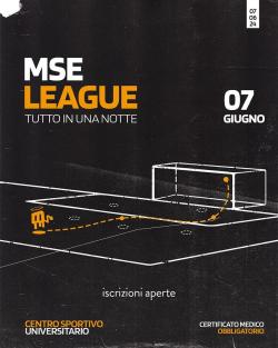 A partire dalle ore 16:00 di venerdì 7 Giugno fino al mattino di Sabato 8 Giugno si terrà “ MSE LEAGUE - torneo di calcio a 5 tutto in una notte “, presso il Centro Sportivo Universitario Unibas!