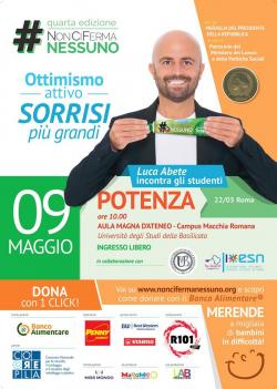 Dal 2014 anni Luca Abete promuove per le università e le scuole italiane una carica di ottimismo con la sua campagna sociale motivazionale #NonCiFermaNessuno, raccontando la sua storia e la sua esperienza di vita, che da studente di provincia, con sacrificio e la voglia di veder realizzato il proprio sogno, è riuscito ad arrivare li dove non avrebbe mai immaginato.