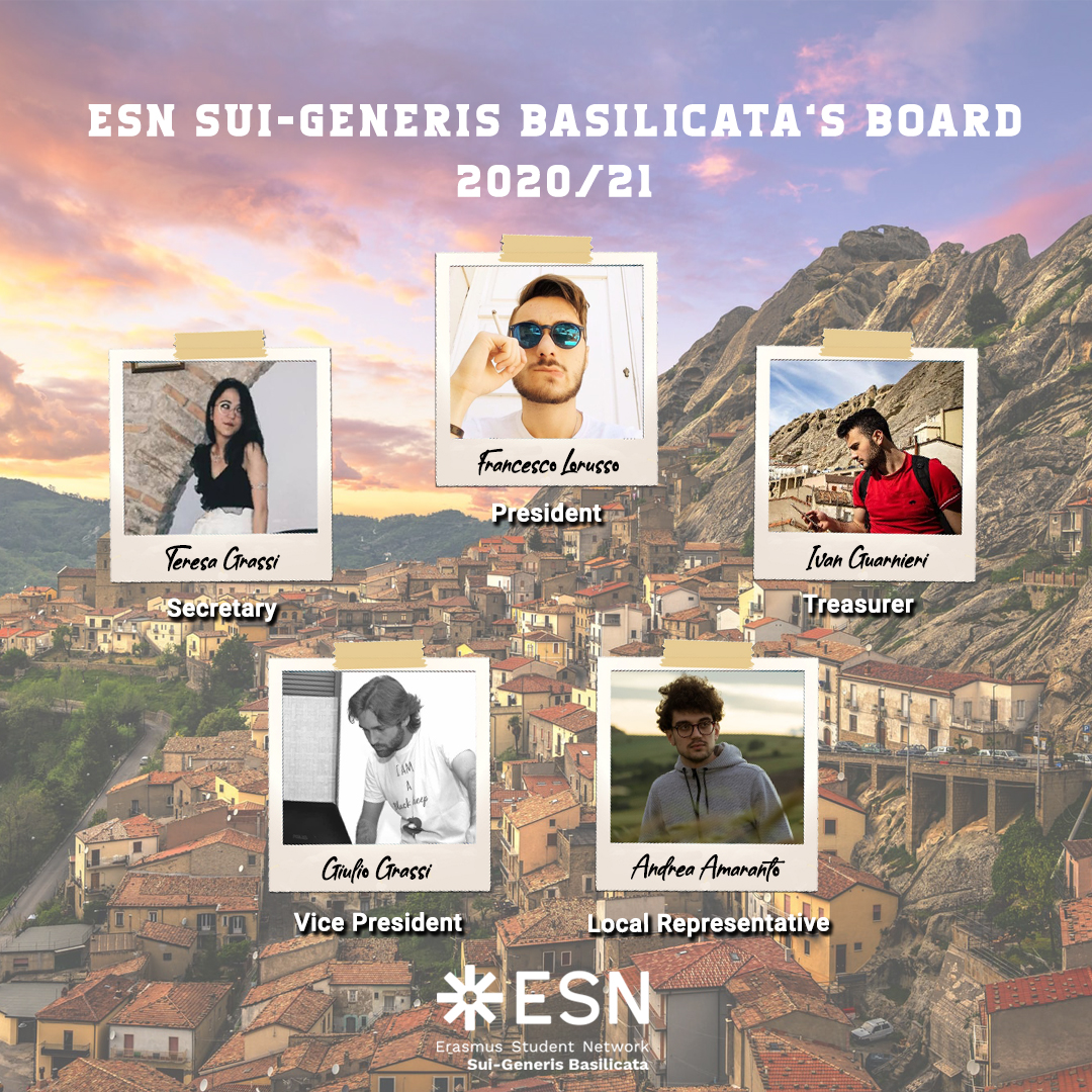 On the last January 27th 2021, following the elections for the renewal of the association's organisation chart, the new Board was elected. ESN Sui-Generis Basilicata is therefore happy to make official and present, among new and confirmed members, the members of the Executive Board 2021/2022.